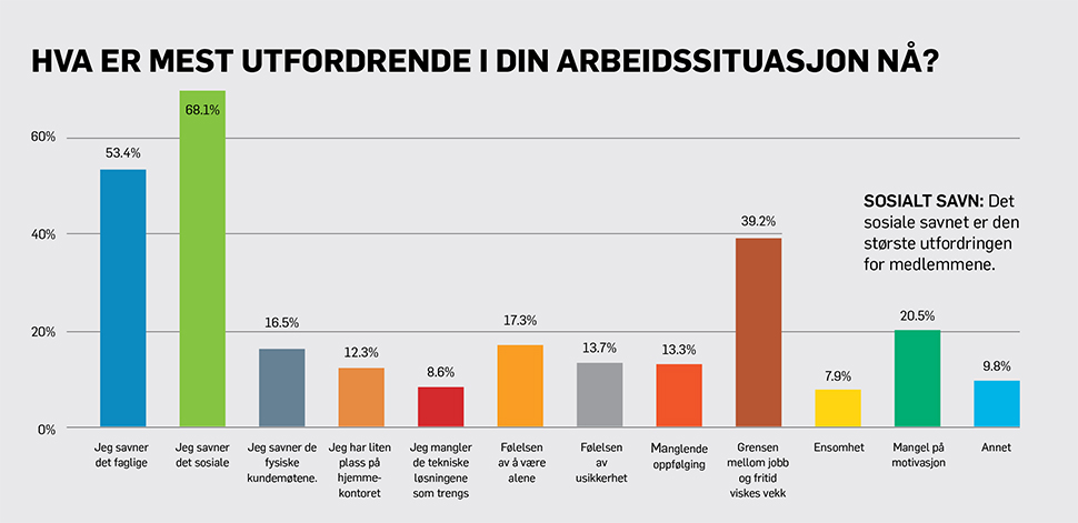 Imidlertid er det utfordringer. Mange ansatte kan føle seg isolerte og ensomme. De trekker seg fra teamets dynamikk og lider av stress og angst. Det er derfor viktig å opprettholde kontakten med sine kolleger og å dyrke en følelse av tilhørighet. Det kan være overraskende tøft for mange å ikke ha sin daglige kontakt med sine kolleger annet enn over et teams, zoom eller skype-møter.