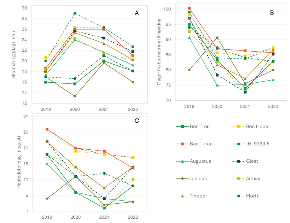 Blomstring: ‘Joniniai’, ‘Ben Tron’ og ‘Mortti’ startet blomstringen tidligst i alle år, mellom 14. og 21. mai (Figur 1A). Sortene ‘Almiai’ og ‘Augustus’ var ‘halv-tidlige’ med begynnende blomstring ca. 21. mai, mens ‘Tihope’, ‘Gjest’, ‘Ben Tirran’, ‘Ben Hope’ og JHI 9163-5 var senest, og blomstret fra 22. til 24. mai. I gjennomsnitt for alle sortene var blomstringen tidligst i 2019, ca. 18. mai, og senest i 2020 og 2021, med begynnende blomstring ca. 23. mai.