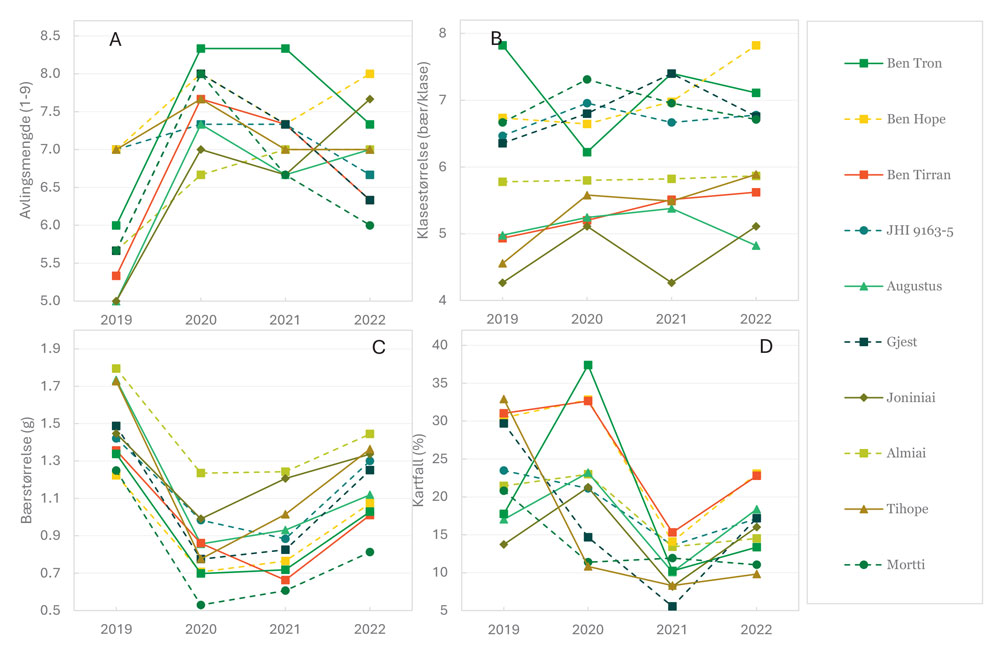 Bærmodning: ‘Augustus’, ‘Joniniai’ og ‘Ben Tron’ var tidligst høstemodne, ca. 8. august, mens ‘Almiai’, ‘Gjest’, ‘Mortti’ og ‘Tihope’ var høsteklare 4 til 7 dager senere (ca. 14. august). JHI 9163-5, ‘Ben Hope’ og ‘Ben Tirran’ modnet seinest, ca. 21. august (Figur 1C). Alle sortene var sent høstemodne i 2019 med høstetidspunkt rund 21. august, mot 9. august i 2021.