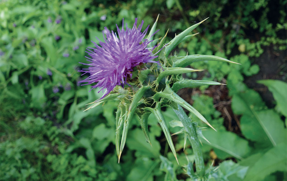 MARIATISTEL Silybum marianum, fotografert i Modum. Mariatistel er en gammel medisinplante og inneholder silibinin, som kan brukes i behandlingen av amatoksinforgiftning. FOTO: OLE BJØRN BRAATHEN.