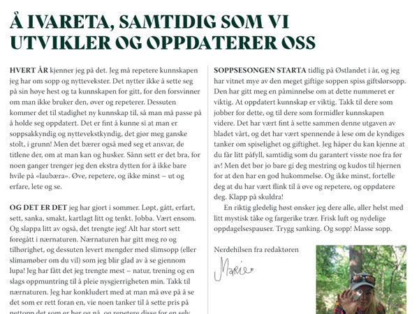 SOPPSESONGEN STARTA tidlig på Østlandet i år, og jeg har vitnet mye av den meget giftige soppen spiss giftslørsopp. Den har gitt meg en påminnelse om at dette nummeret er viktig. At oppdatert kunnskap er viktig. Takk til dere som jobber for dette, og til dere som formidler kunnskapen videre. Det har vært fint å sette sammen denne utgaven av bladet vårt, og det har vært spennende å lese om de kyndiges tanker om spiselighet og giftighet. Jeg håper du kan kjenne at du får litt påfyll, samtidig som du garantert visste noe fra før av! Men det bør jo bare gi deg mestring og kudos til hjernen for at den har en god hukommelse. Og ikke minst, fortelle deg at du har vært flink til å øve og repetere, og oppdatere deg. Klapp på skuldra!