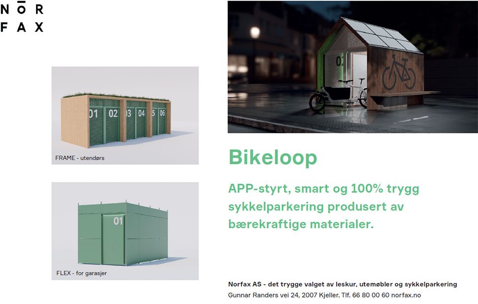 Sykkelstativer, servicestasjoner, sykkelpumper, overdekninger, sykkelskur- og hoteller og 2-etasjes parkeringsløsninger