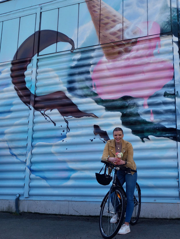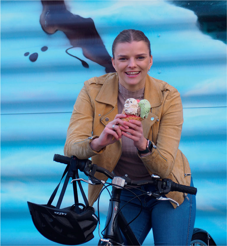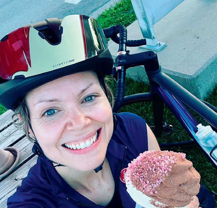 SYKKELNISTE: Gunhild Tørhaugen påstår at hun har knekkebrød med seg som niste på sykkeltur, men her har hun jammen flesket til og kjøpt seg en deilig is. Foto: Privat